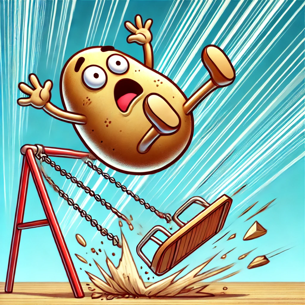 When they got on the swing they noticed that they had been going very fast. So little potato’s sister slowed down but it was too late to get off for little potato because his swing snapped off the bar.