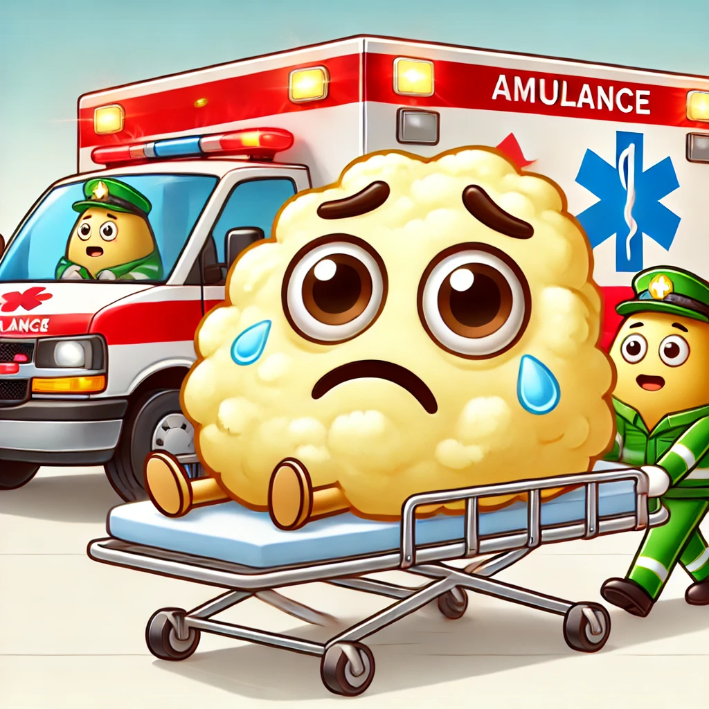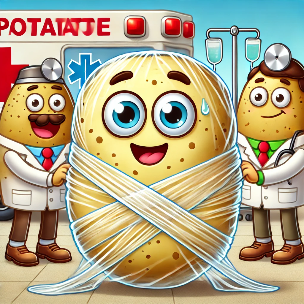 When his mummy and daddy came, they called the potato ambulance to come and help them. When the doctors got there they put him in the ambulance and took him to the hospital.