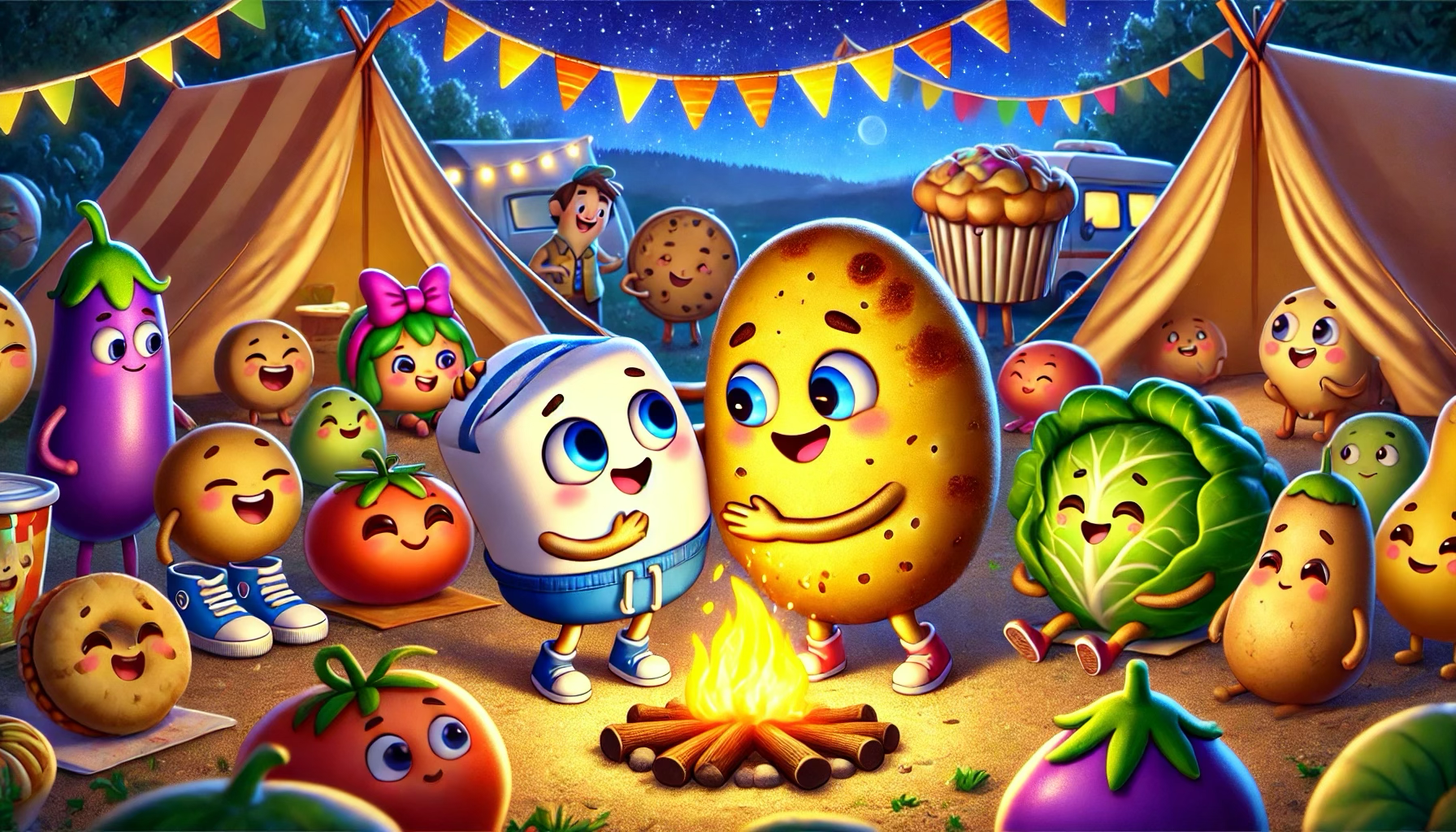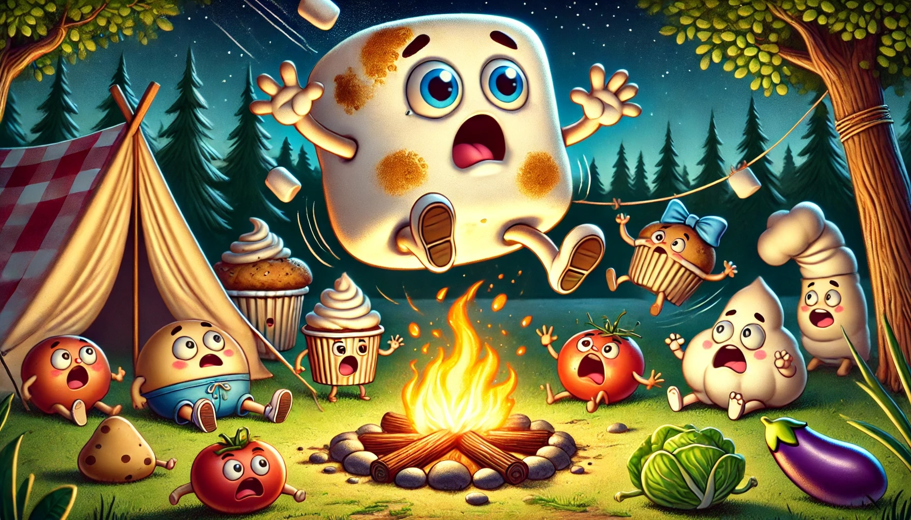 As Big Fat Marshmallow was running around chasing everyone, he didn’t see the campfire in front of him. He tripped and fell right into the fire! Everyone froze, their eyes wide in shock. No one could say anything. Big Fat Marshmallow started to turn brown, and everyone just stood there, not sure what to do.